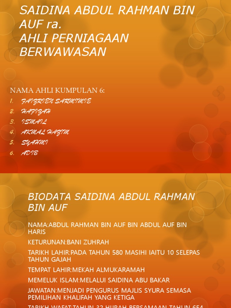 Abdul Rahman Bin Auf dilahirkan sepuluh tahun setelah tahun Gajah iaitu tahun kelahiran Nabi Muhammad SAW. Abdul rahman ibn auf bahasa arab. BIODATA -ABDUL RAHIM BIN ABDUL RASHAD PEWARIS BERADAT SILAT KUNINGAN SINGAPURA PENGASAS SENAMAN SILAT.